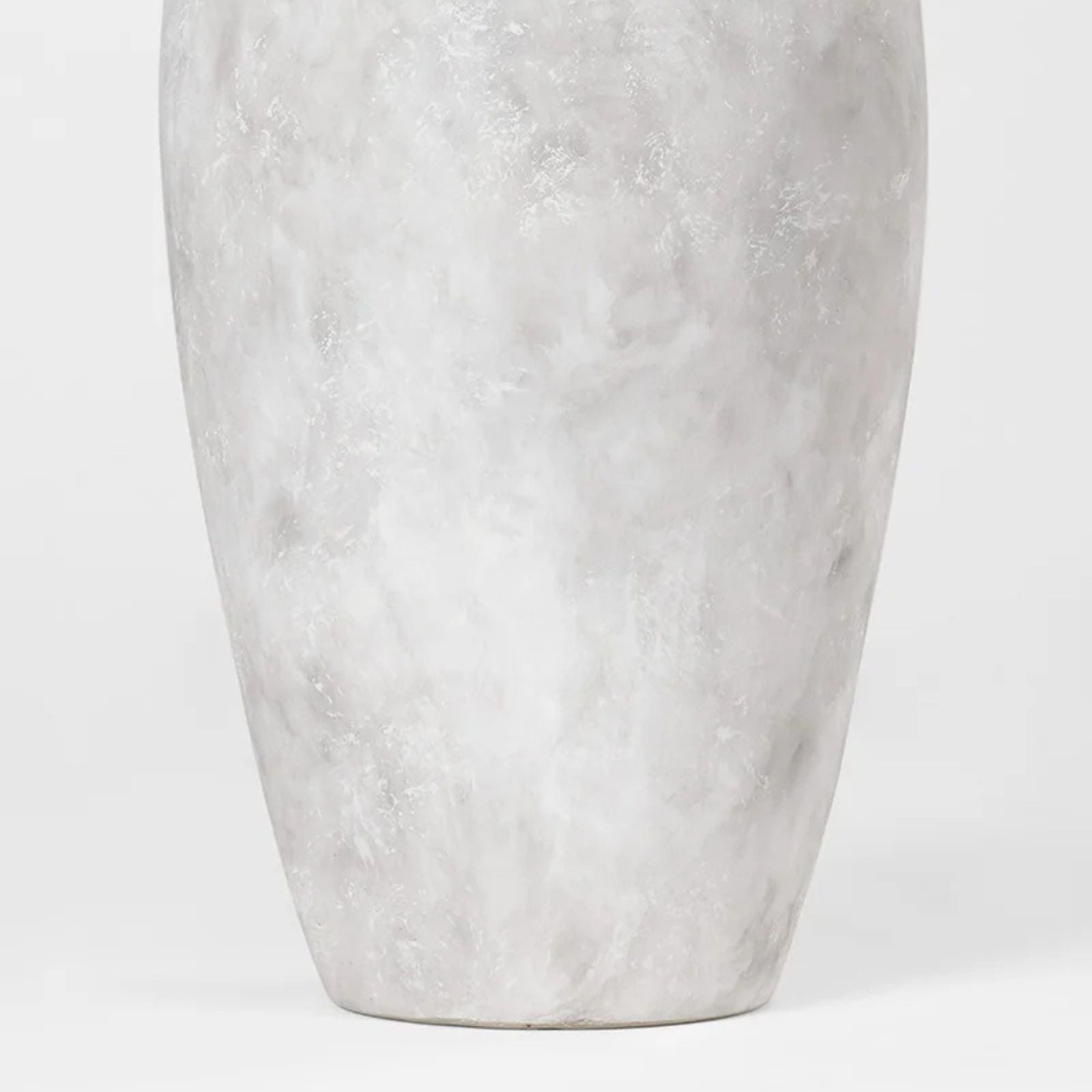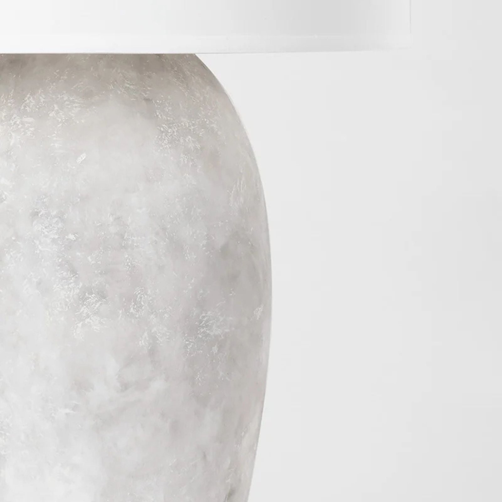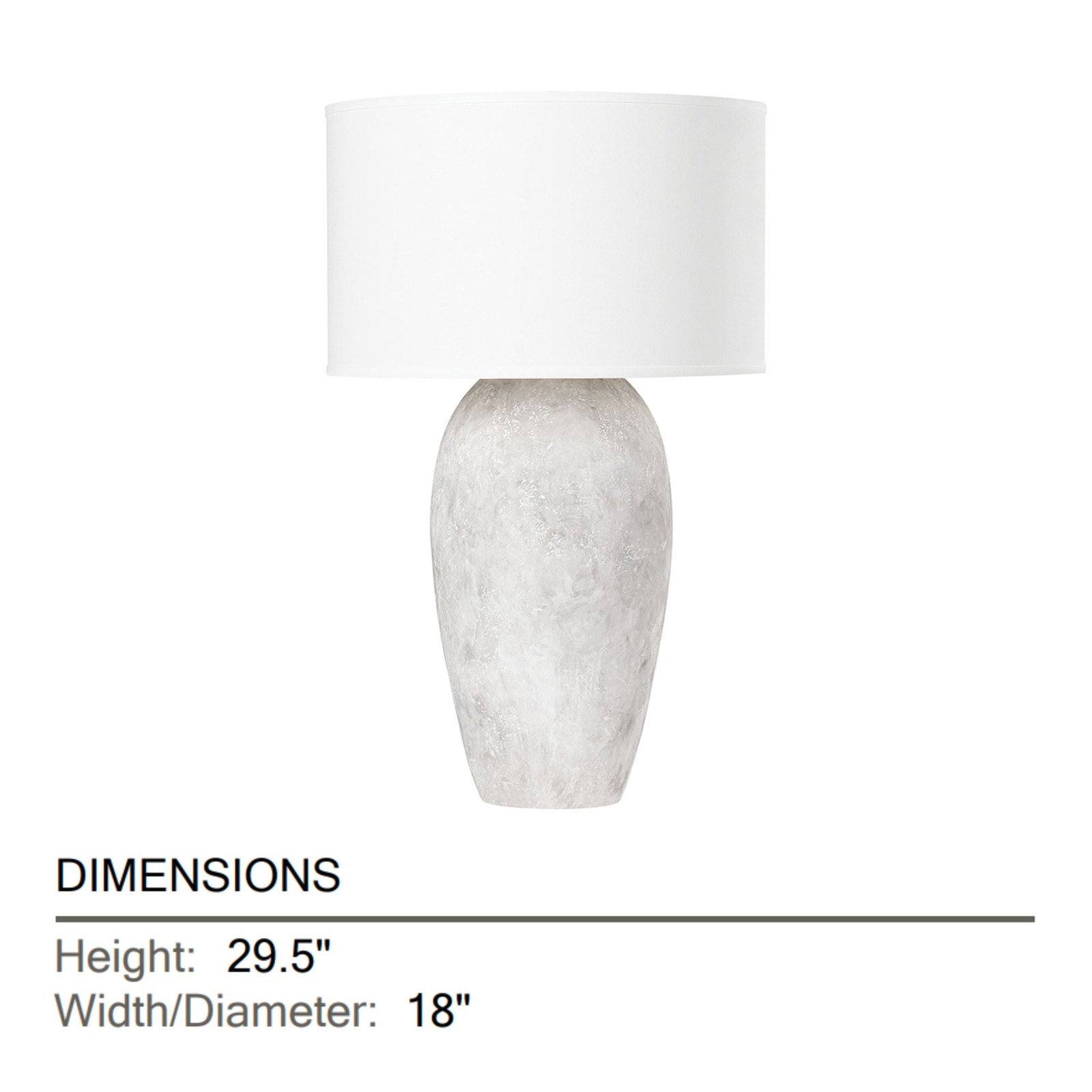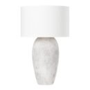The Troy Lighting PTL1020-CWG Zeke 30″ table lamp makes a significant statement with its larger scale and sculptural form. The base is a tall vase-shaped base in a beautiful ceramic weathered grey finish that gives the lamp its sculpted earthy feel. Light shines from the top, where an off-white linen drum shade allows it to fill the shade and highlight the striations and grey hues of the ceramic base below. The larger scale makes this neutral, natural table lamp stand out in any living space, bringing a subtle, organic texture.